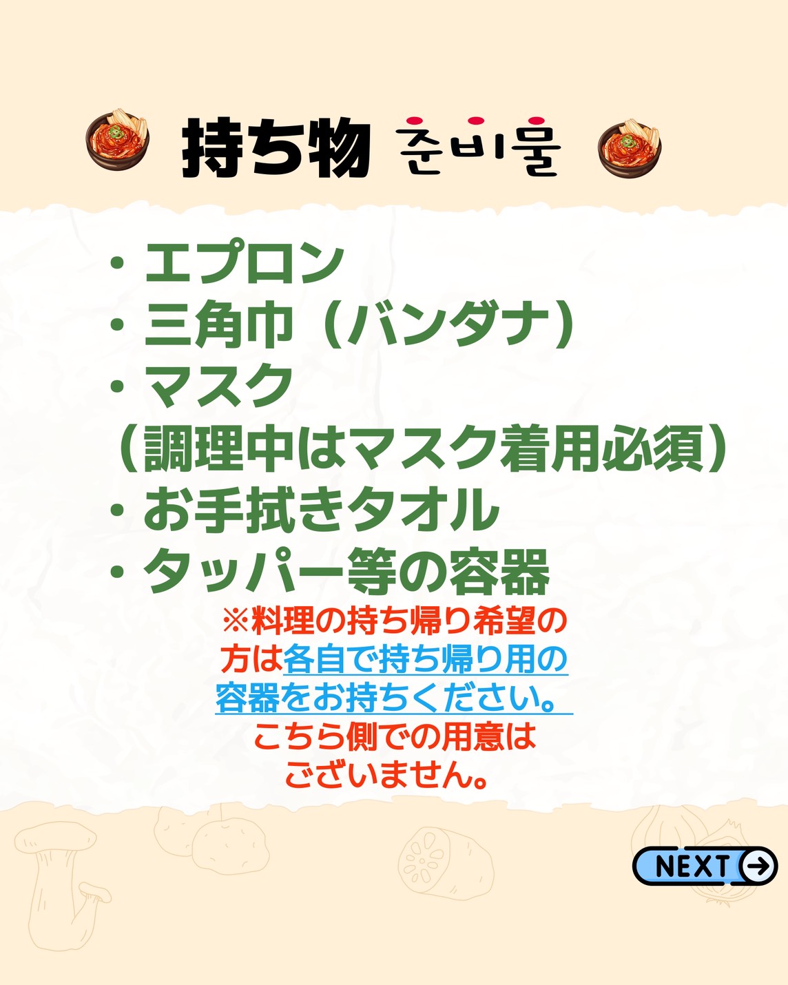 📍持ち物:エプロン・三角巾(バンダナ)・ハンドタオル(お手拭きや食器を拭く用のふきん等)